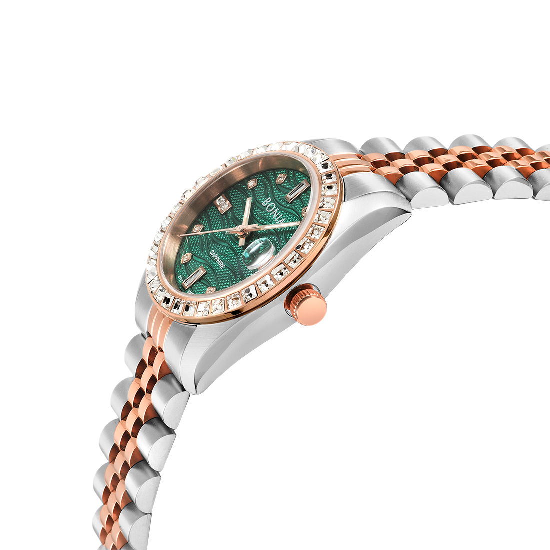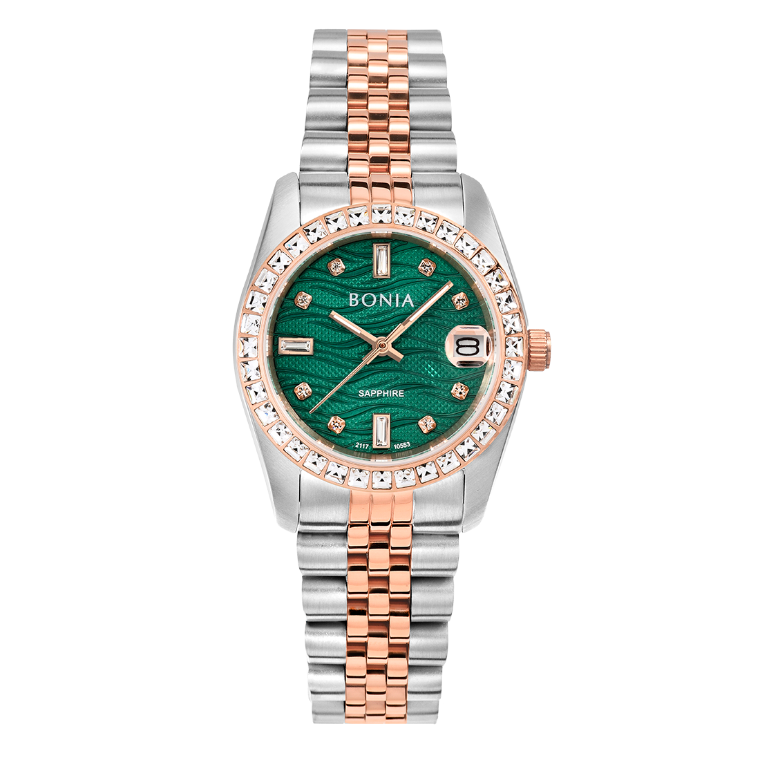 ケース:ステンレス/ツートンローズゴールドIP バンド:ステンレス/ツートンローズゴールドIP 風防:サファイアガラス |