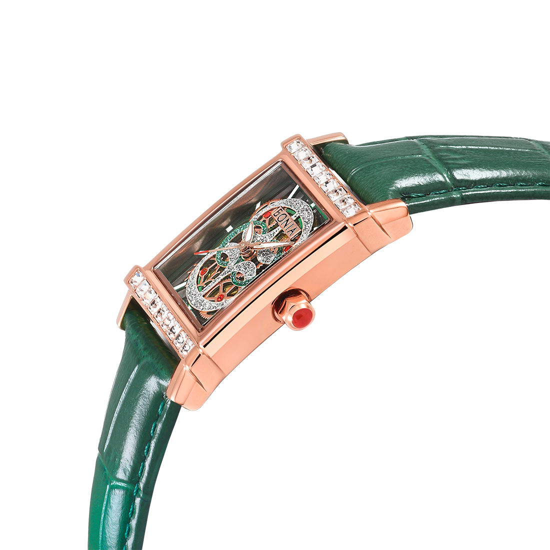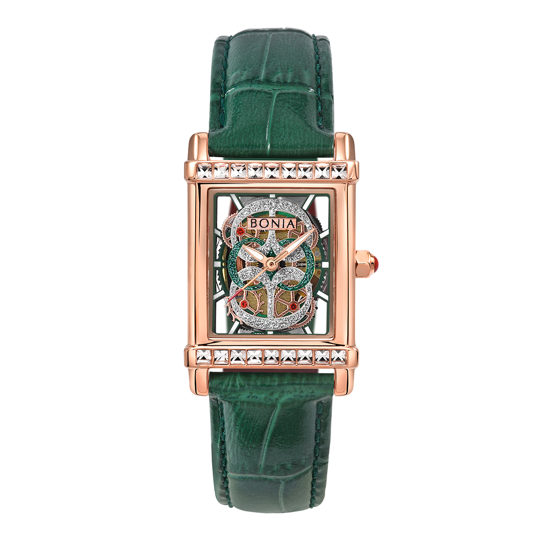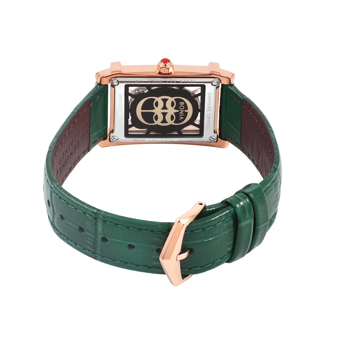 ケース:ステンレス/ローズゴールドIP バンド:革/グリーン 風防:サファイアガラス |