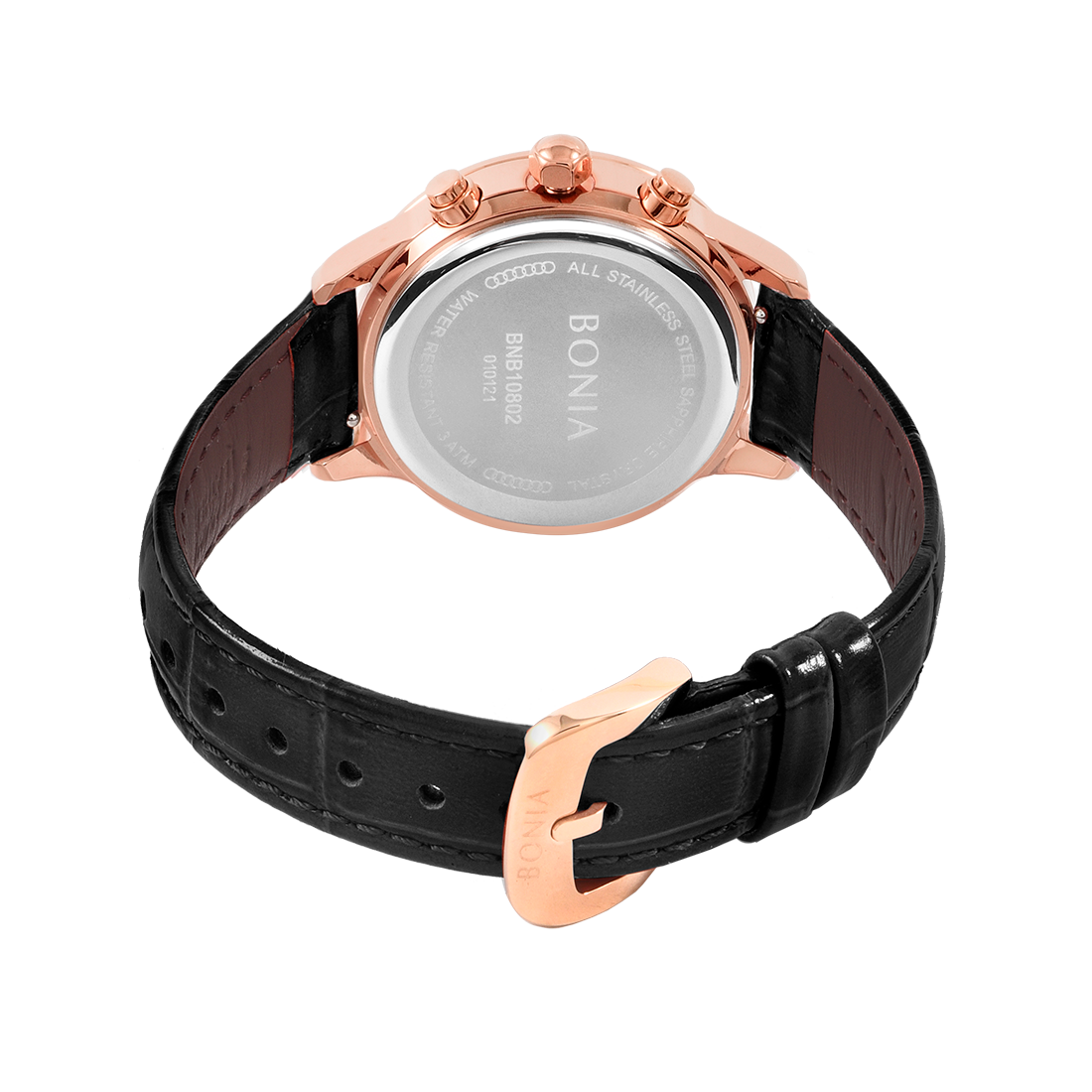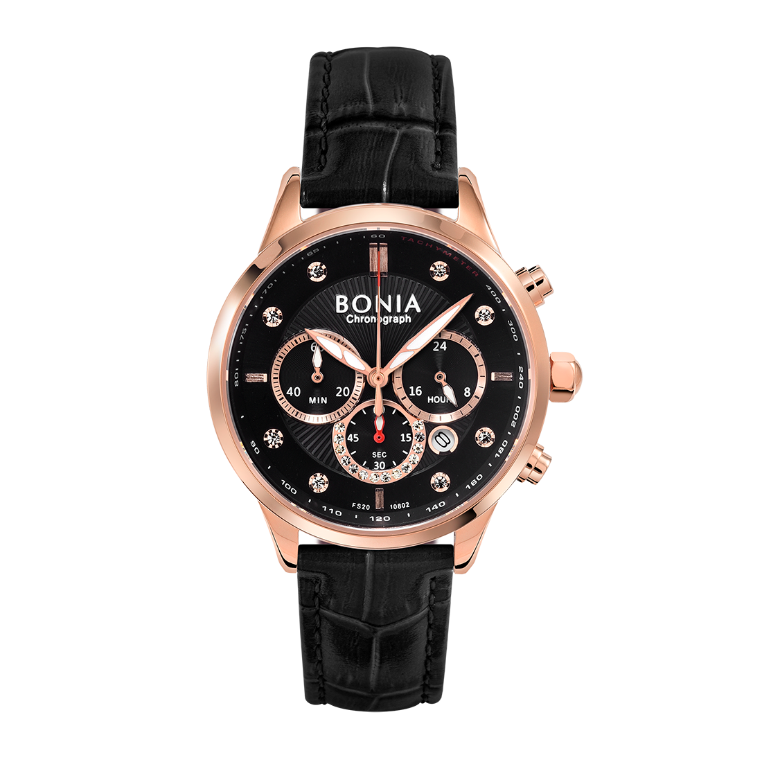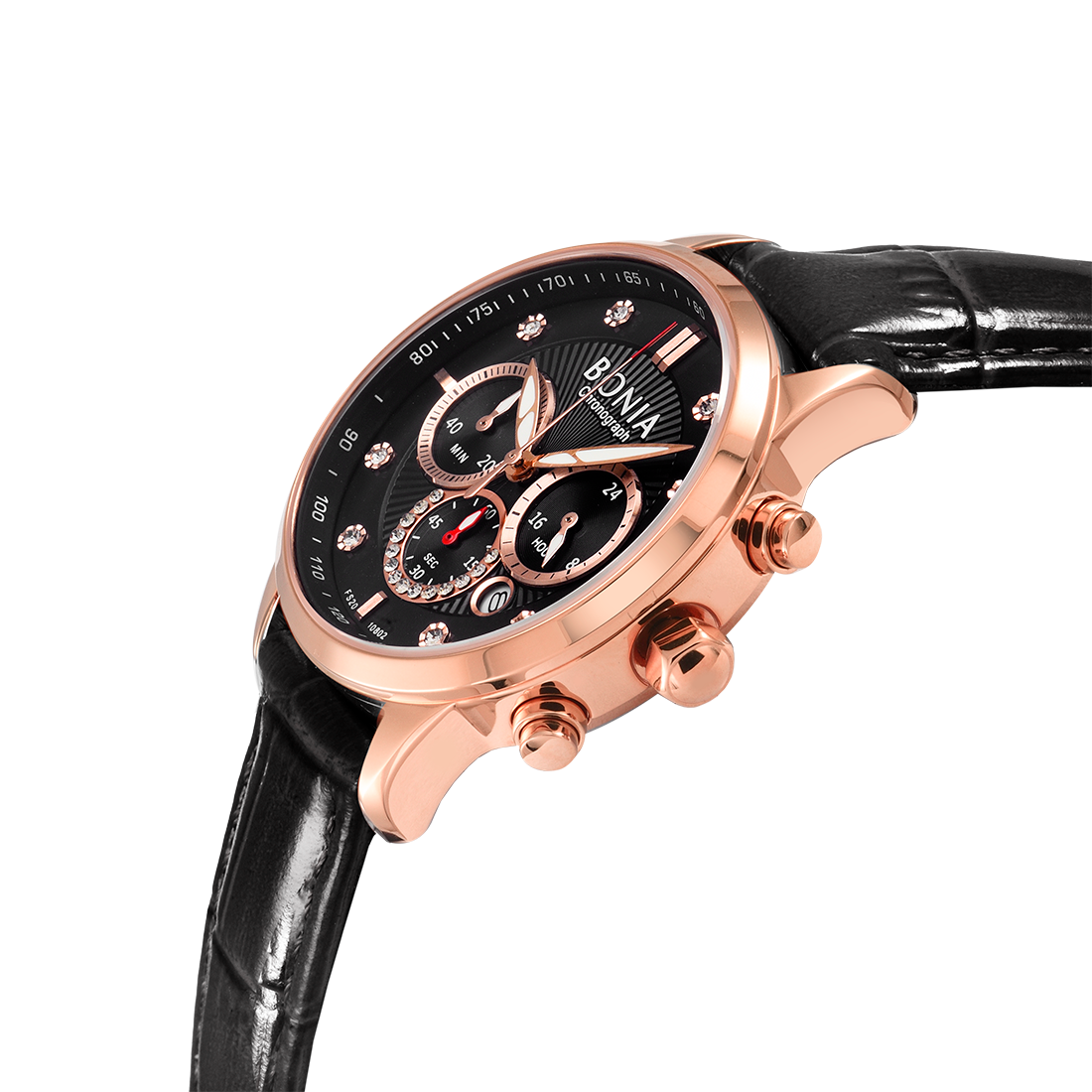 ケース:ステンレス/ローズゴールドIP バンド:革/ブラック 風防:サファイアガラス |