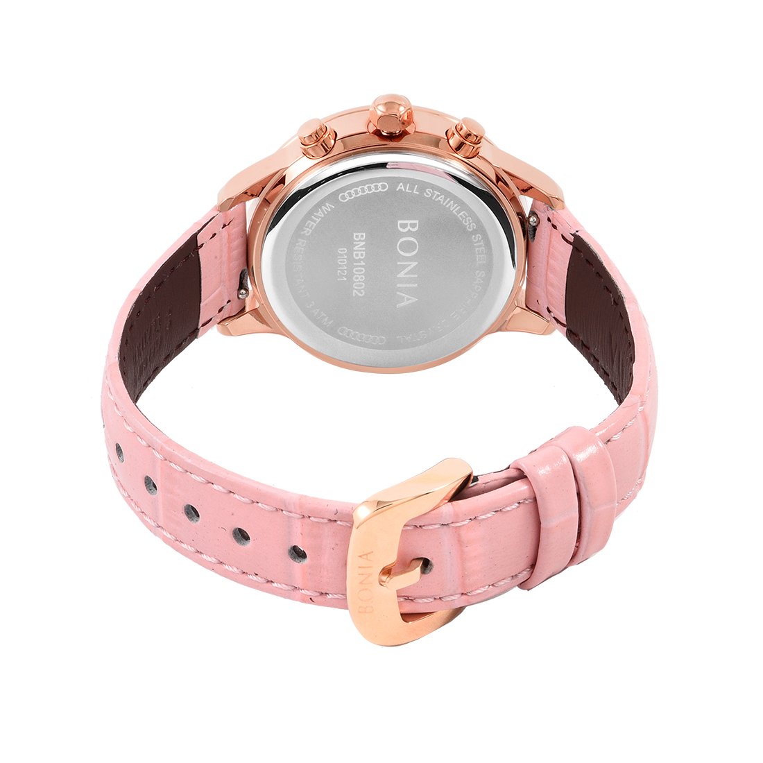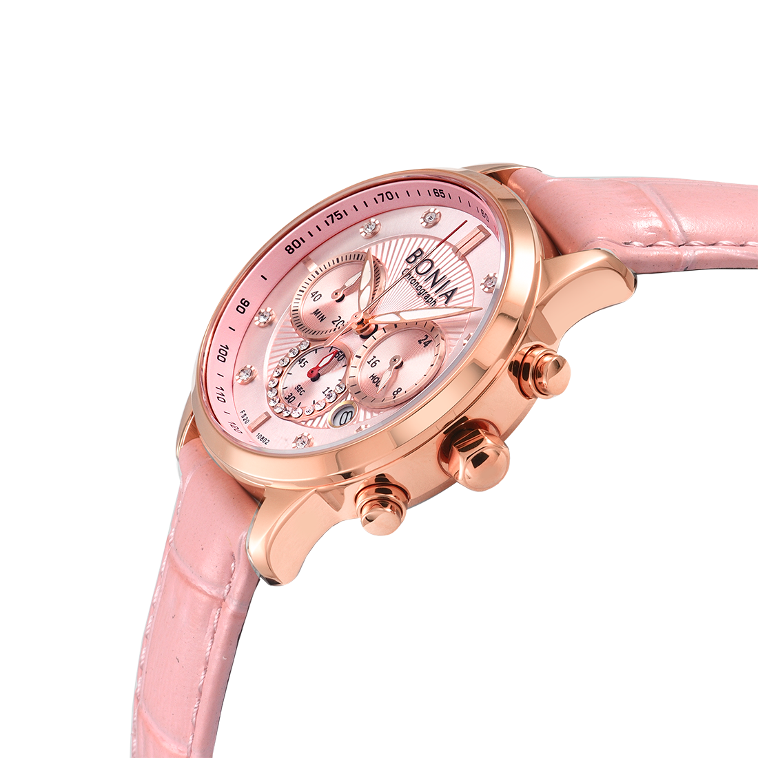 ケース:ステンレス/ローズゴールドIP バンド:革/ピンク 風防:サファイアガラス |