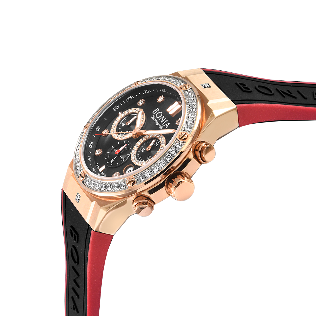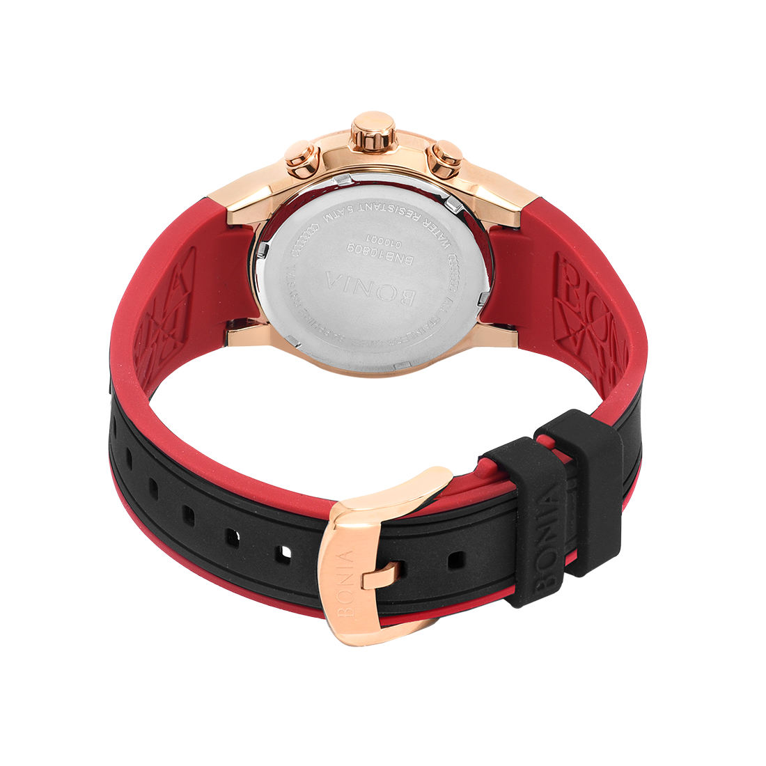 ケース:ステンレス/ローズゴールドIP バンド:シリコン/ワインレッド+ブラック 風防:サファイアガラス |