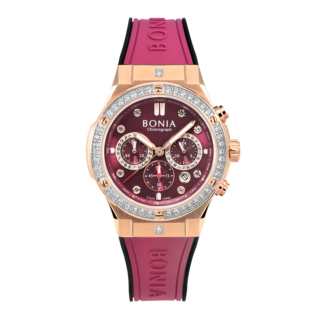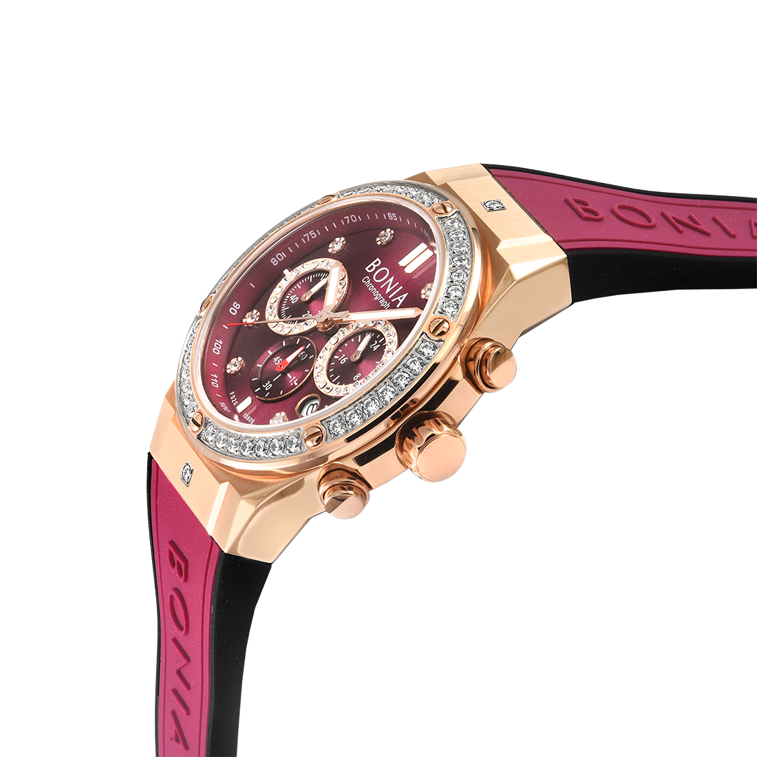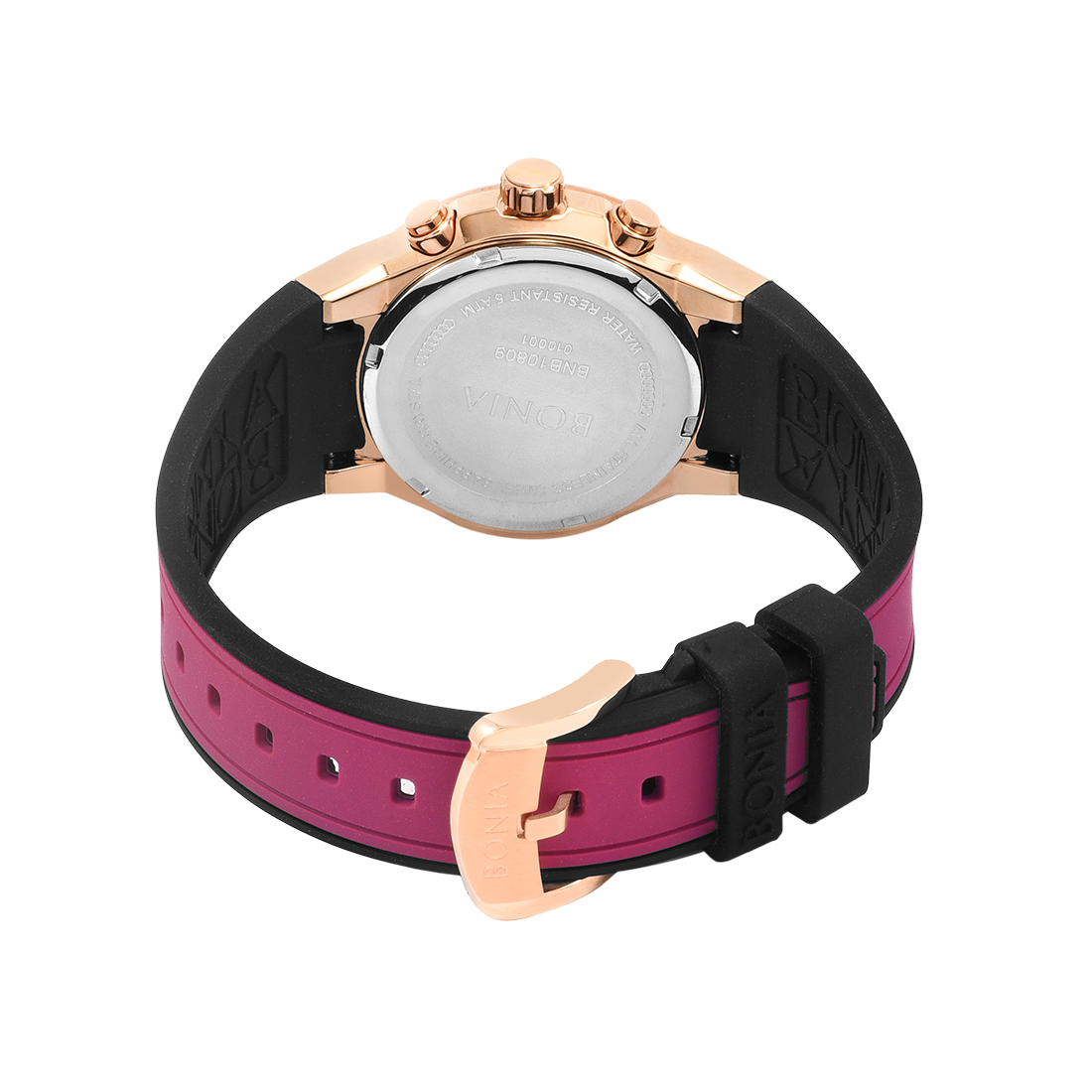 ケース:ステンレス/ローズゴールドIP バンド:シリコン/ブラック+ワインレッド 風防:サファイアガラス |