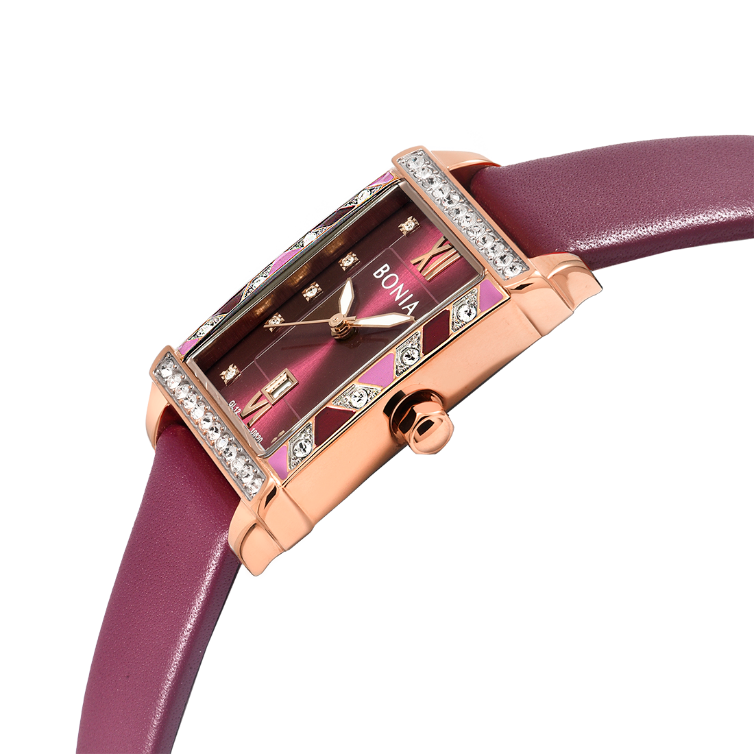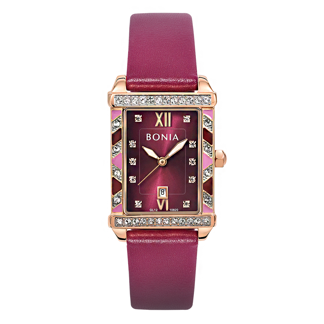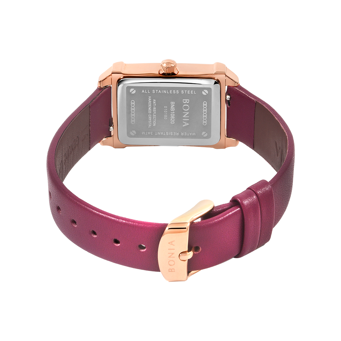 ケース:ステンレス/ローズゴールドIP バンド:革/ワインレッド 風防:ガラス |