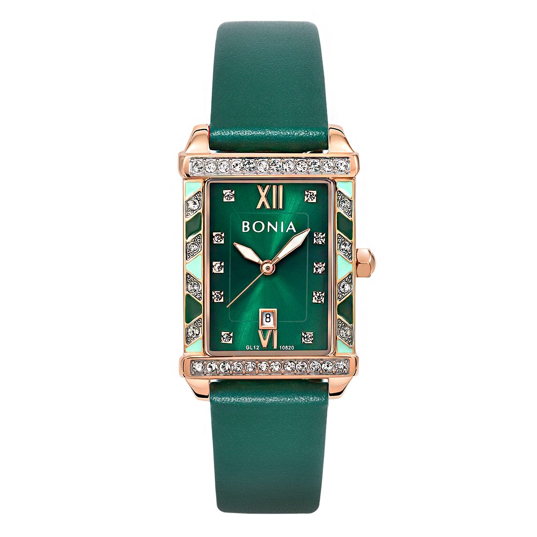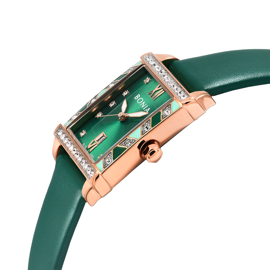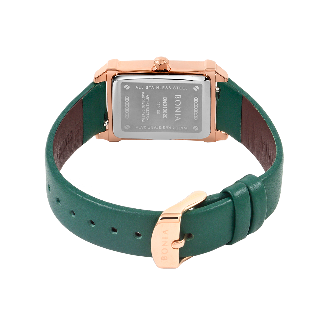 ケース:ステンレス/ローズゴールドIP バンド:革/グリーン 風防:ガラス |