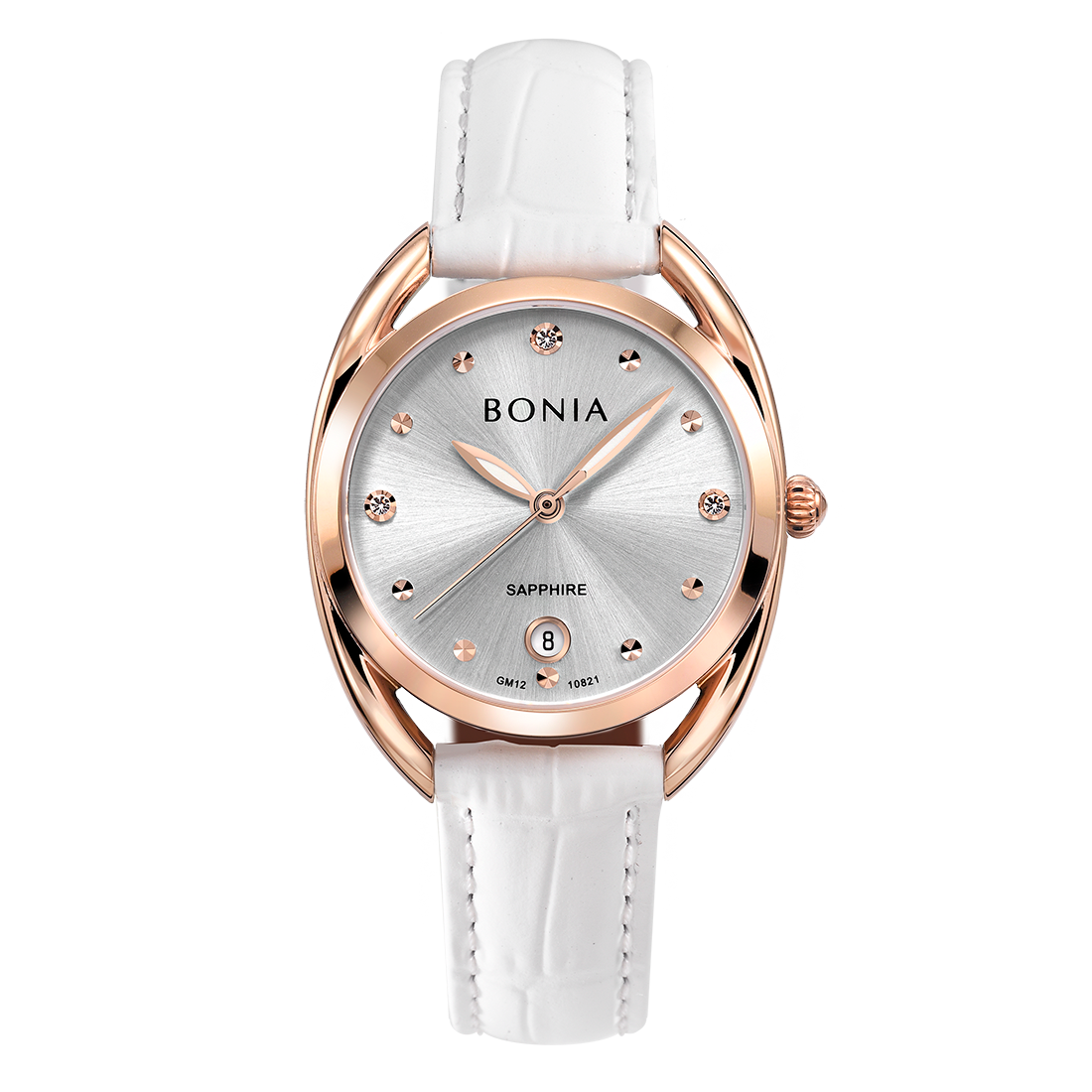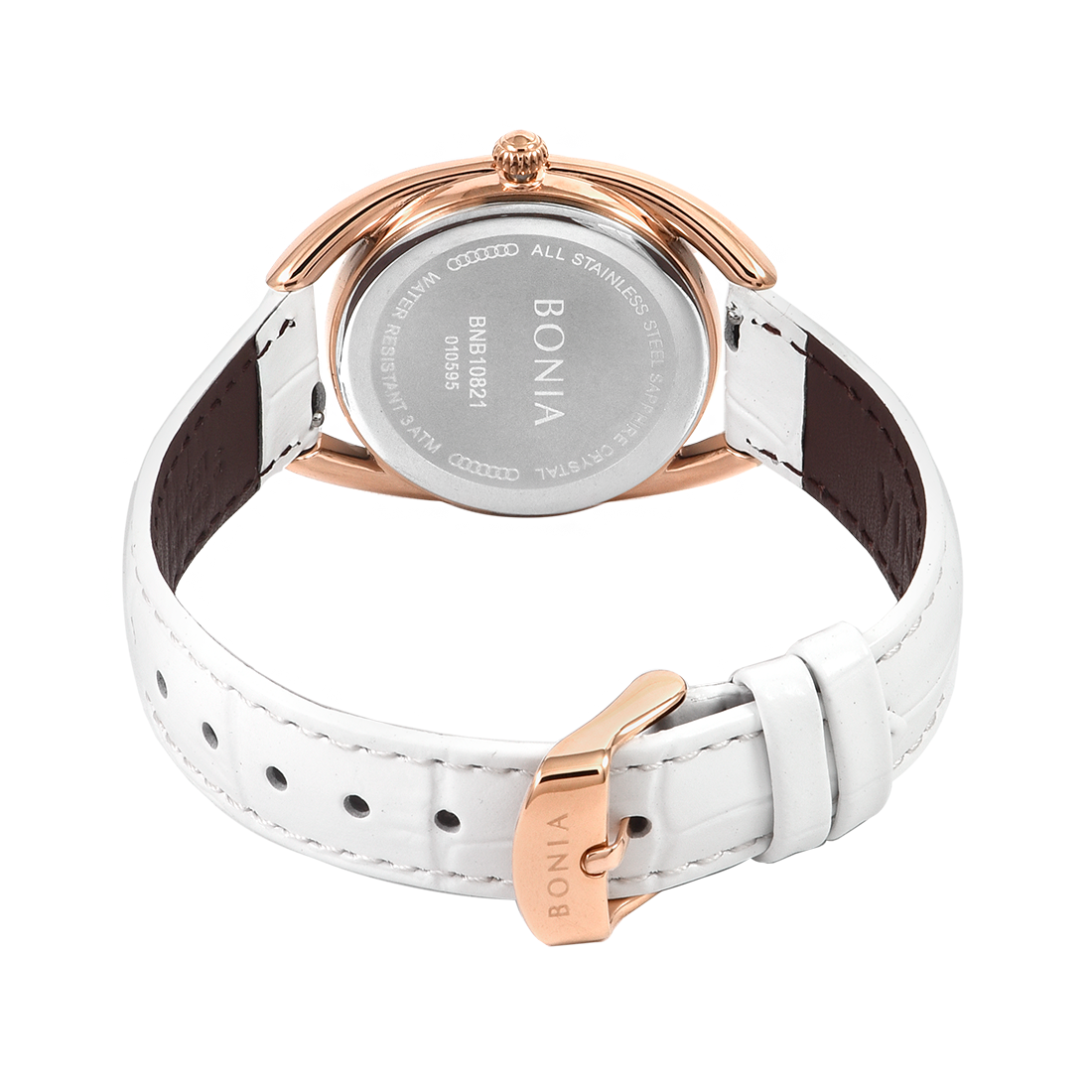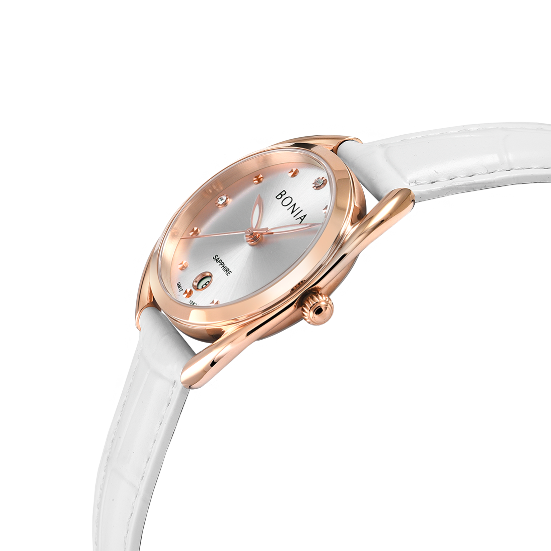 ケース:ステンレス/ローズゴールドIP バンド:革/ホワイト 風防:サファイアガラス |