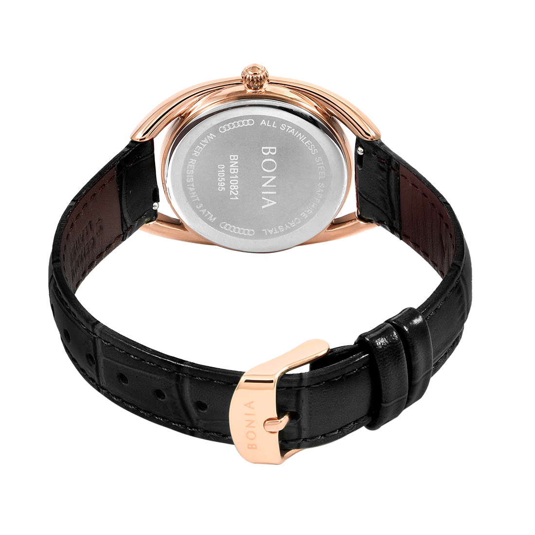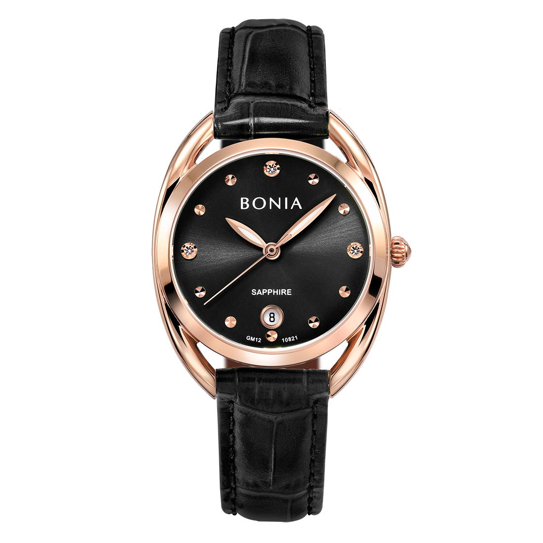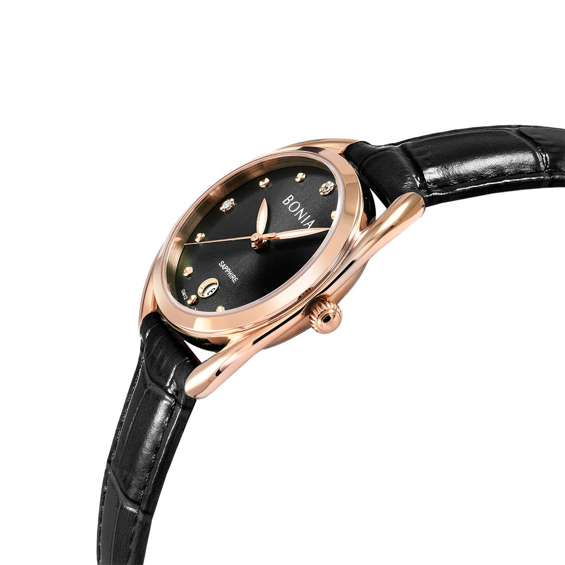 ケース:ステンレス/ローズゴールドIP バンド:革/ブラック 風防:サファイアガラス |