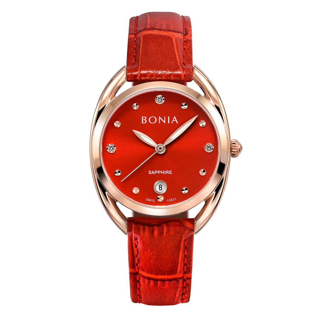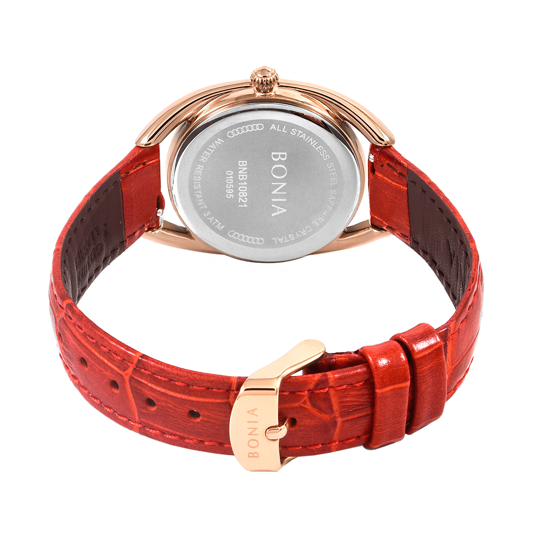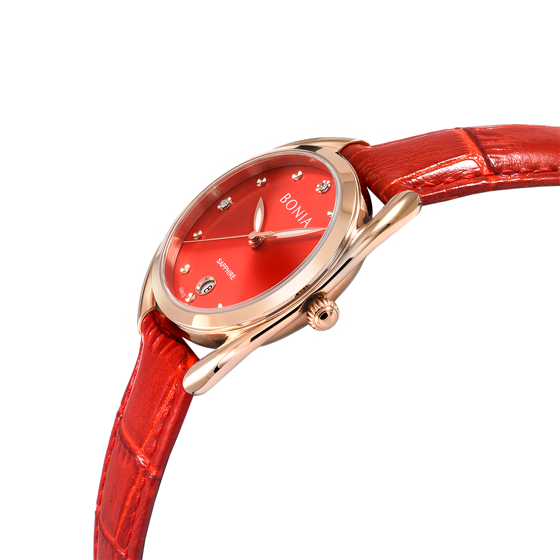 ケース:ステンレス/ローズゴールドIP バンド:革/レッド 風防:サファイアガラス |