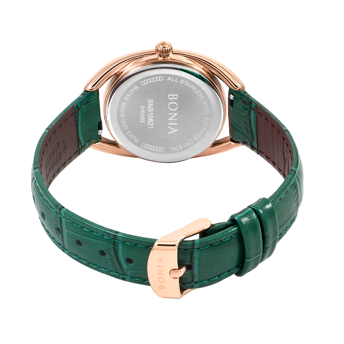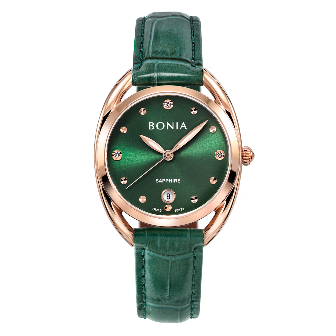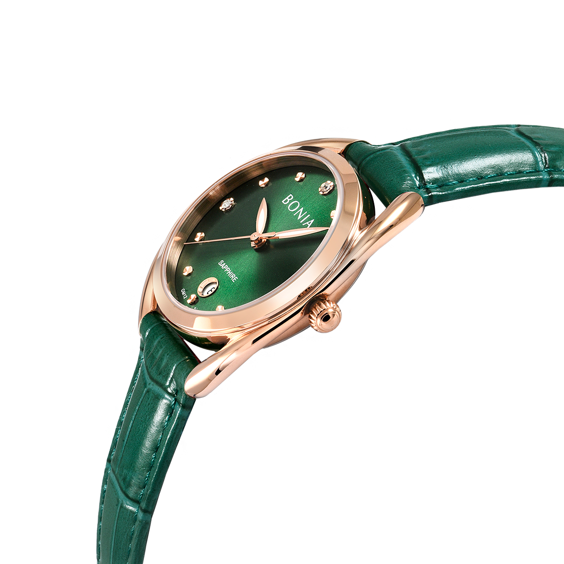 ケース:ステンレス/ローズゴールドIP バンド:革/グリーン 風防:サファイアガラス |