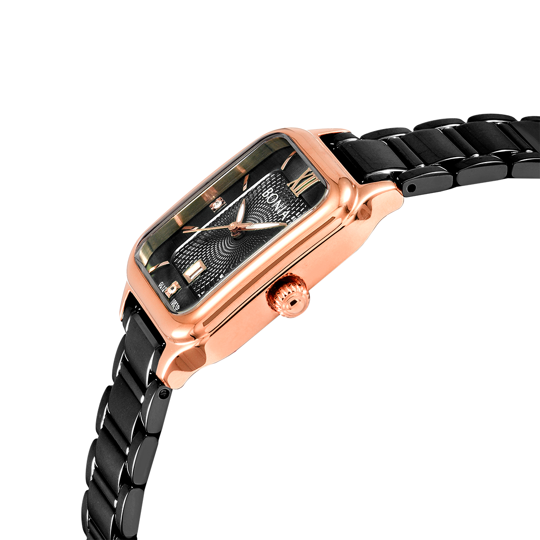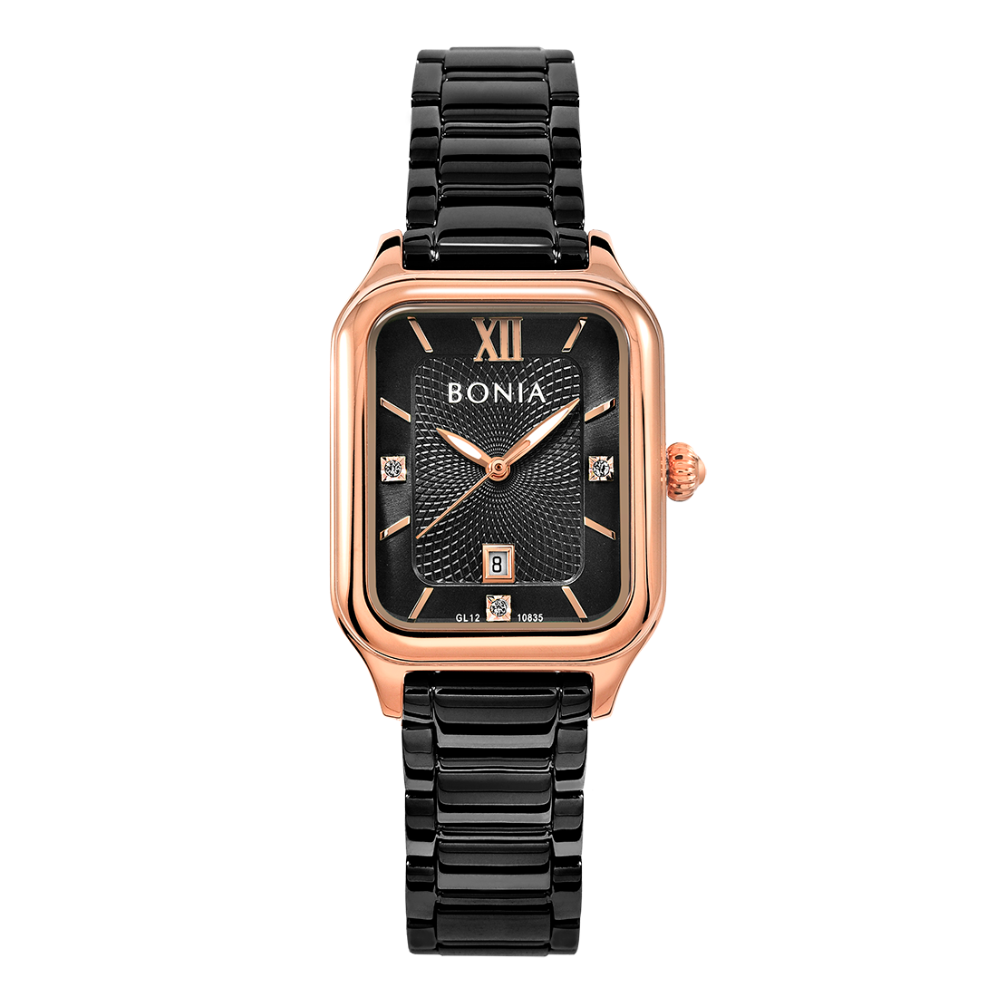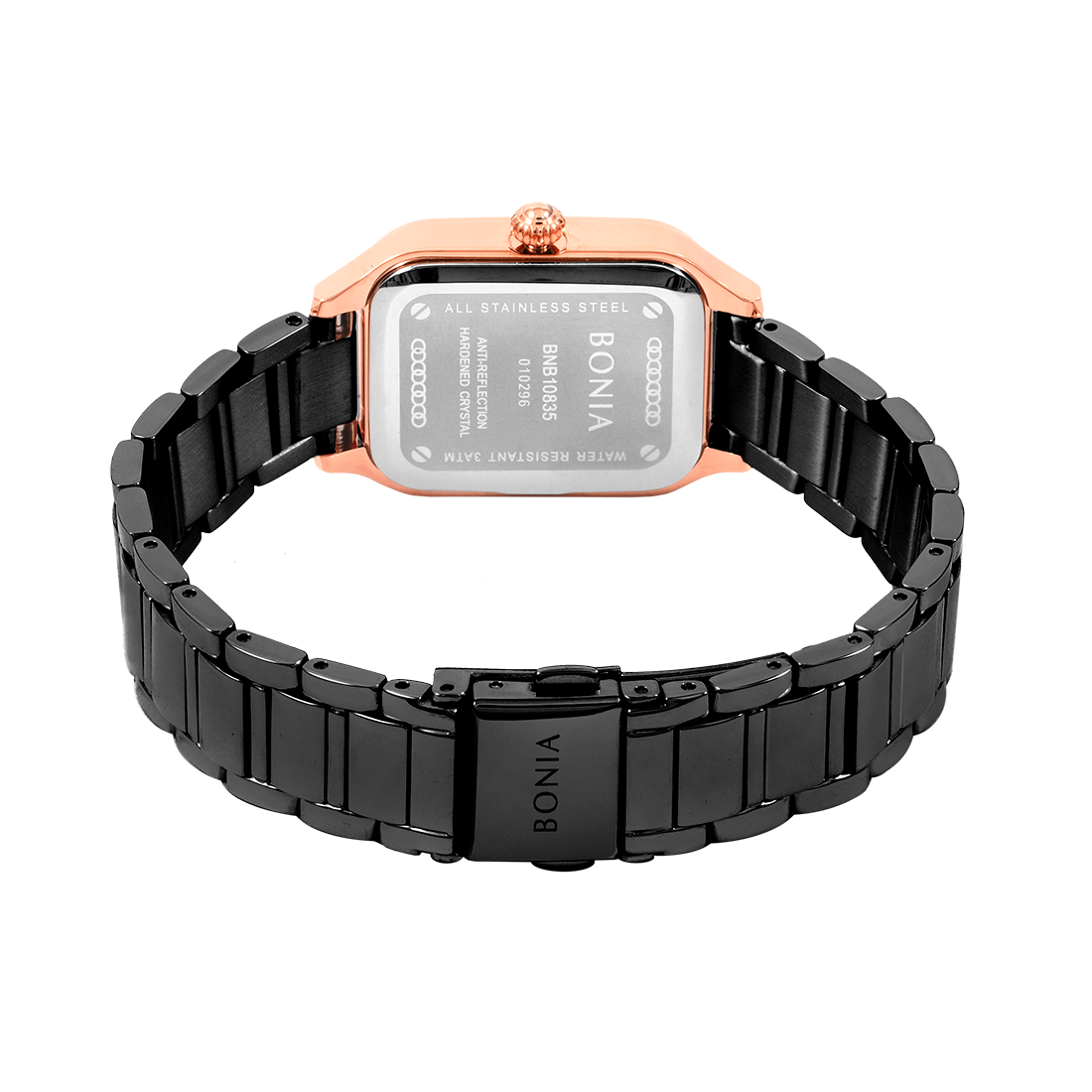 ケース:ステンレス/ローズゴールドIP バンド:ステンレス/ブラックIP 風防:ガラス |