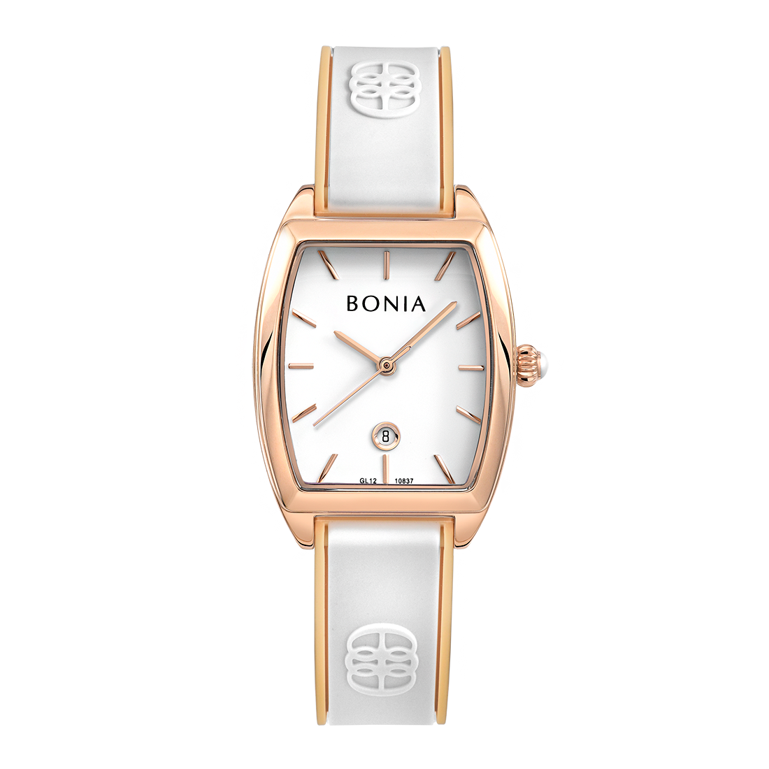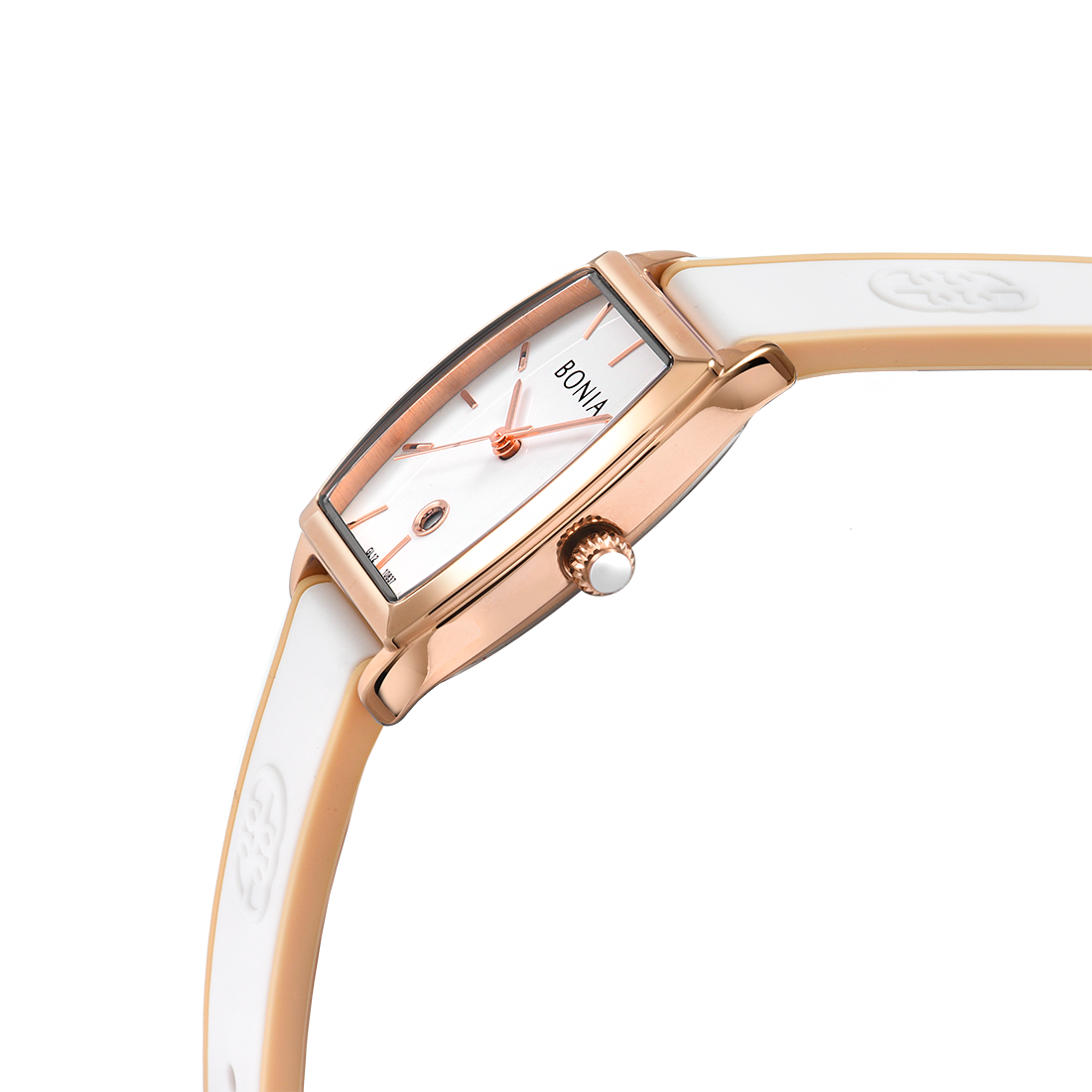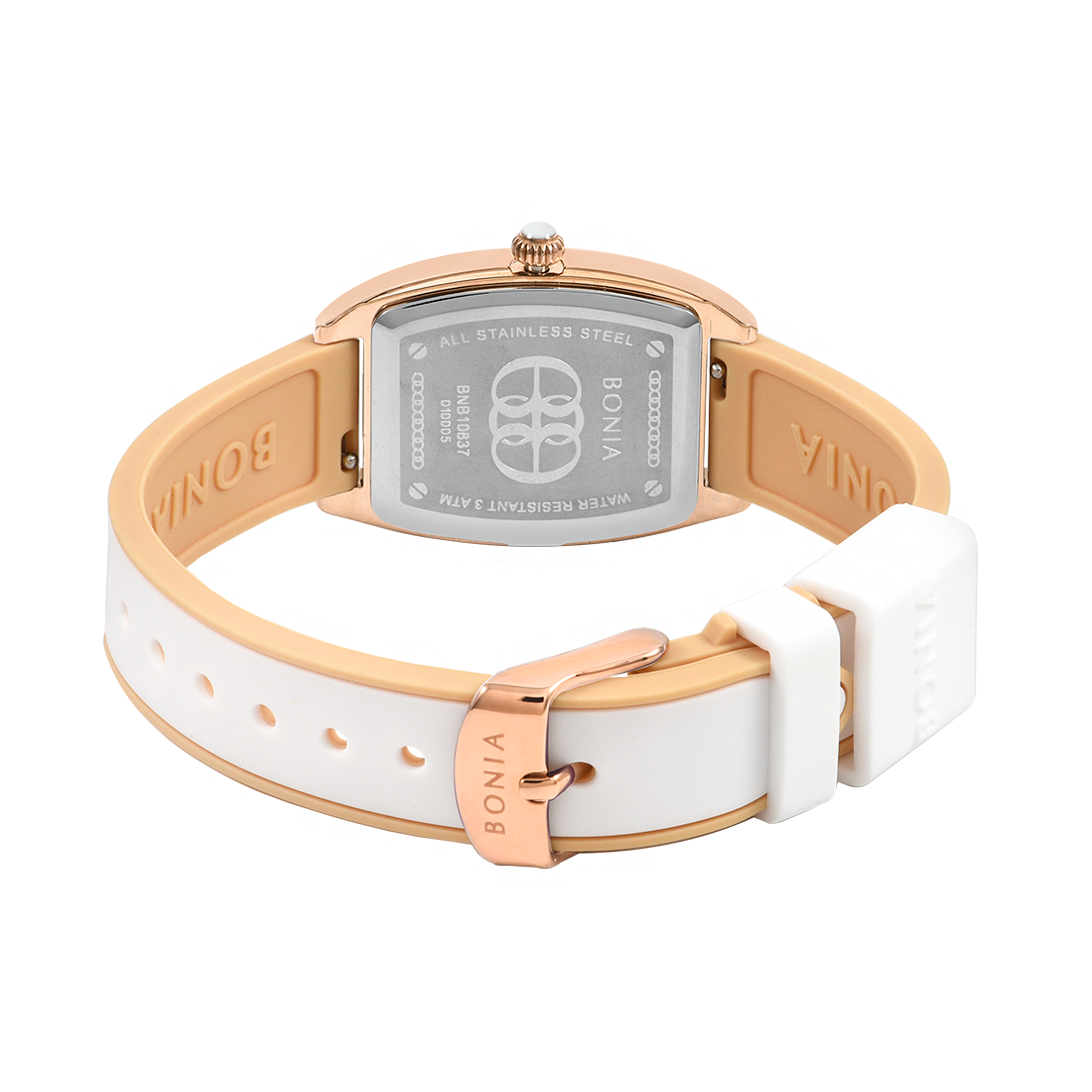 ケース:ステンレス/ローズゴールドIP バンド:シリコン/ローズゴールド+ホワイト 風防:ガラス |