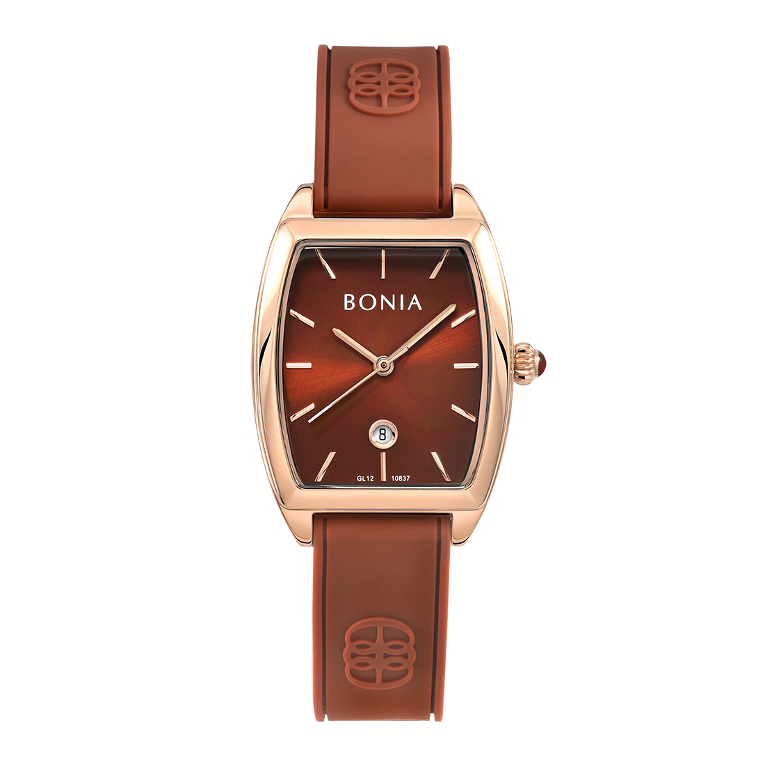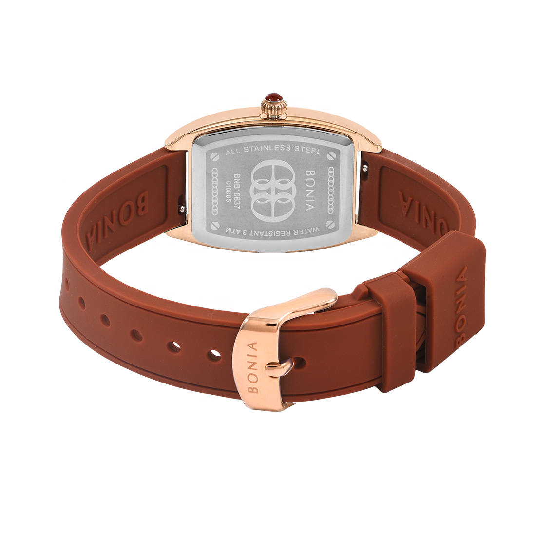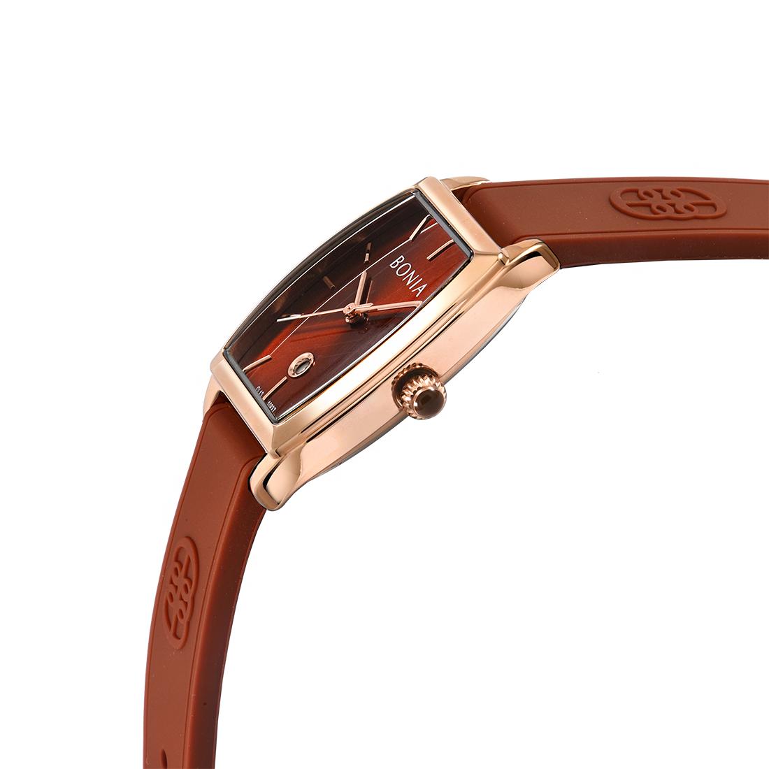 ケース:ステンレス/ローズゴールドIP バンド:シリコン/ブラウン 風防:ガラス |