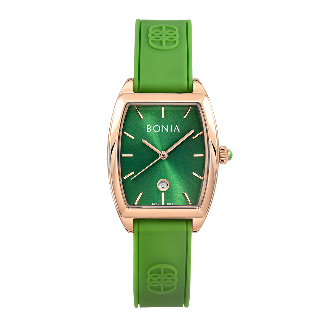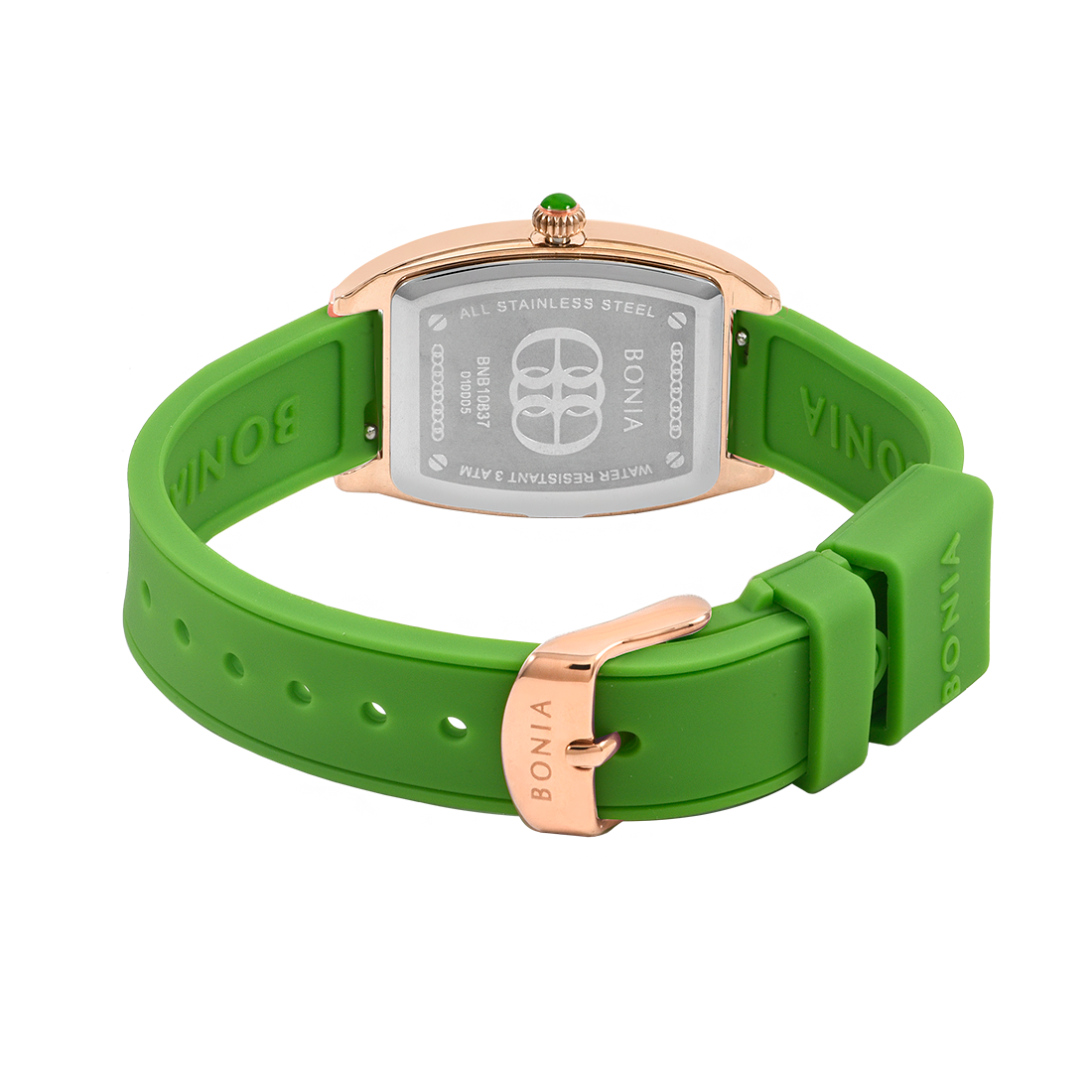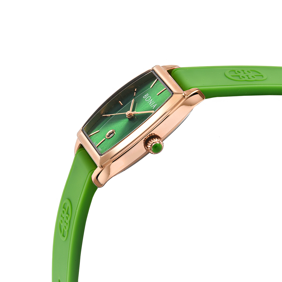 ケース:ステンレス/ローズゴールドIP バンド:シリコン/グリーン 風防:ガラス |
