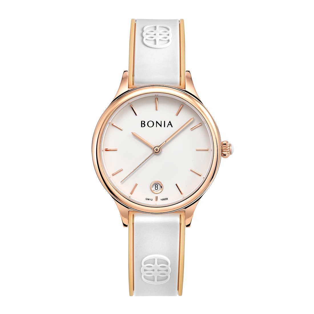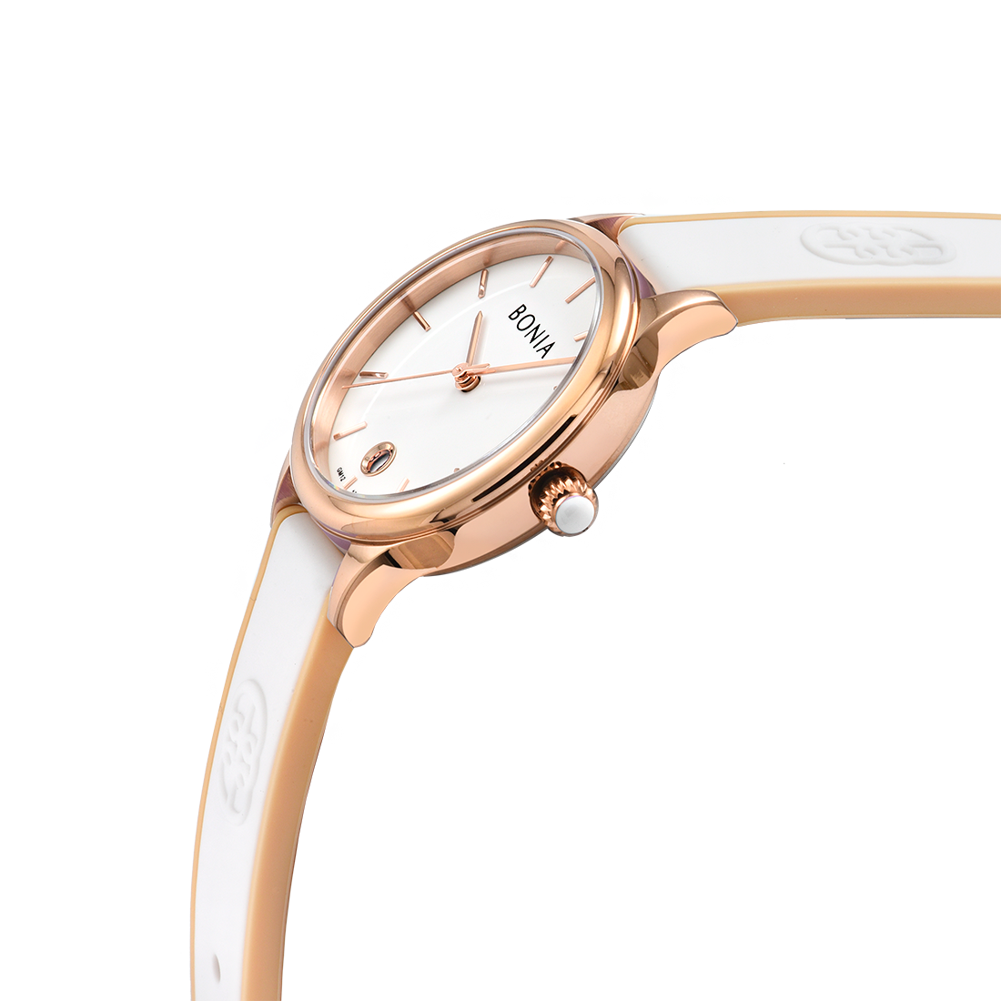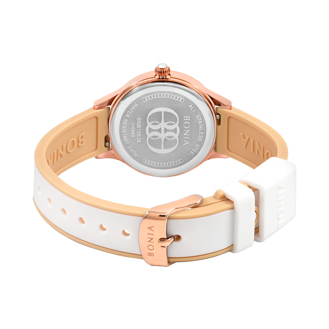 ケース:ステンレス/ローズゴールドIP バンド:シリコン/ローズゴールド+ホワイト 風防:ガラス |