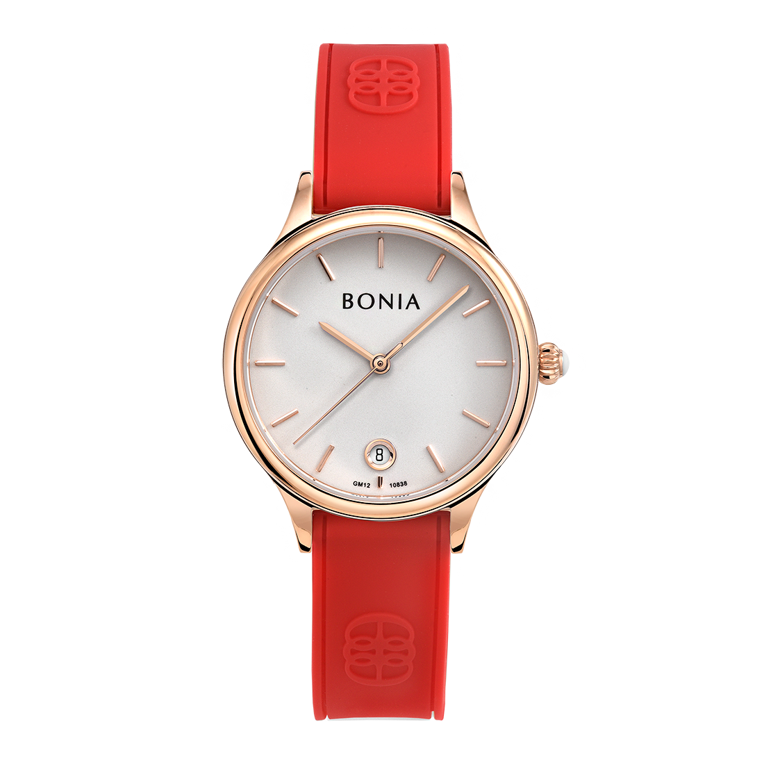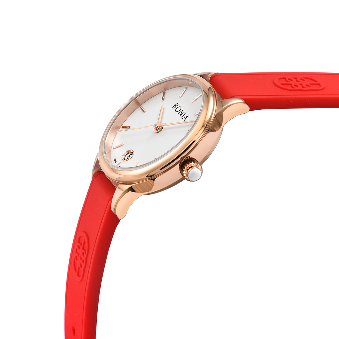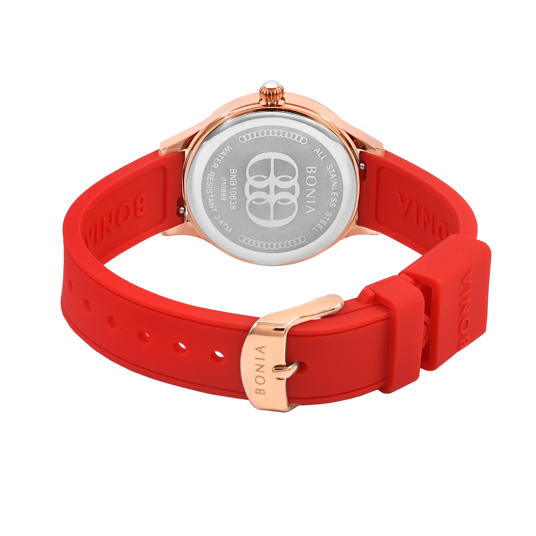 ケース:ステンレス/ローズゴールドIP バンド:シリコン/レッド 風防:ガラス |