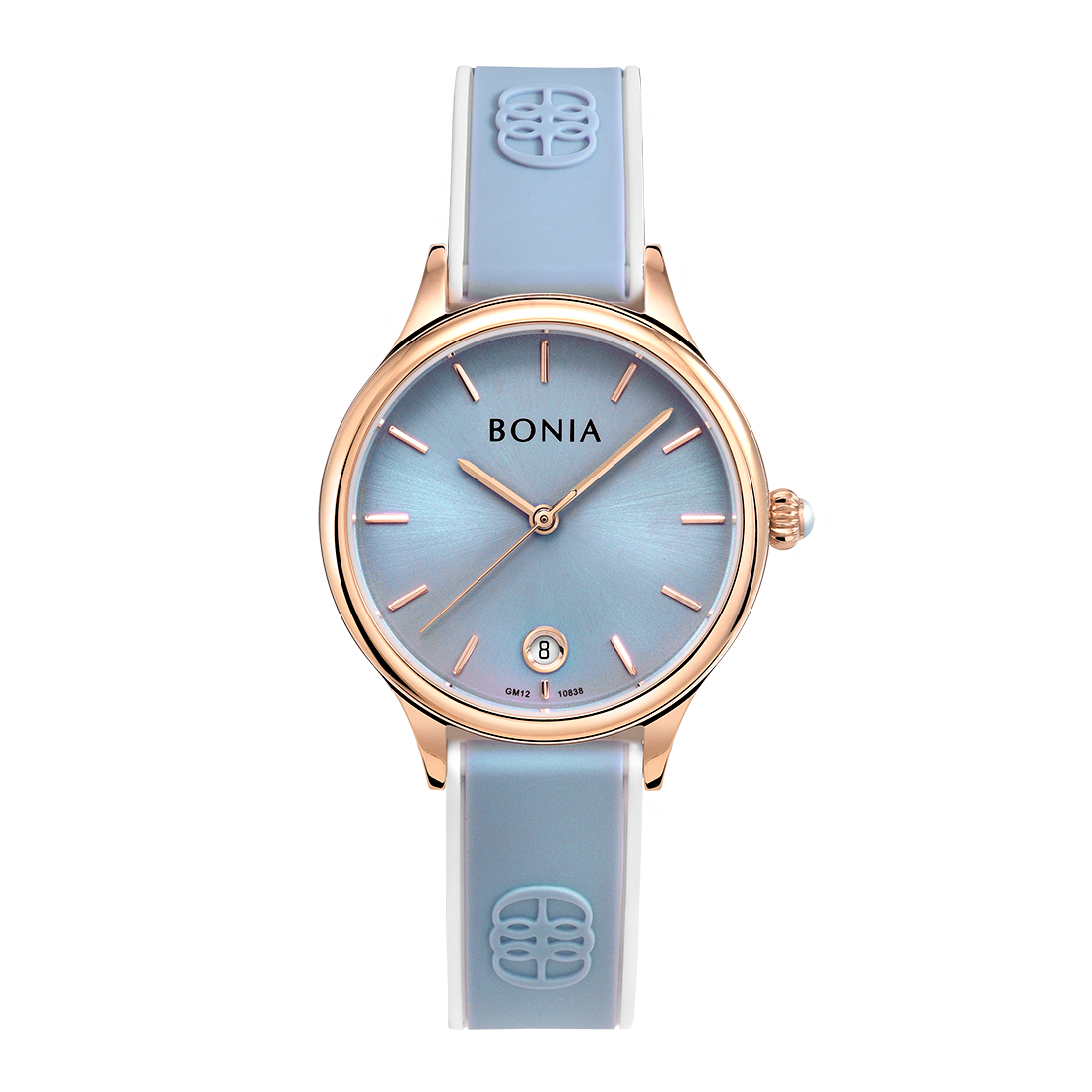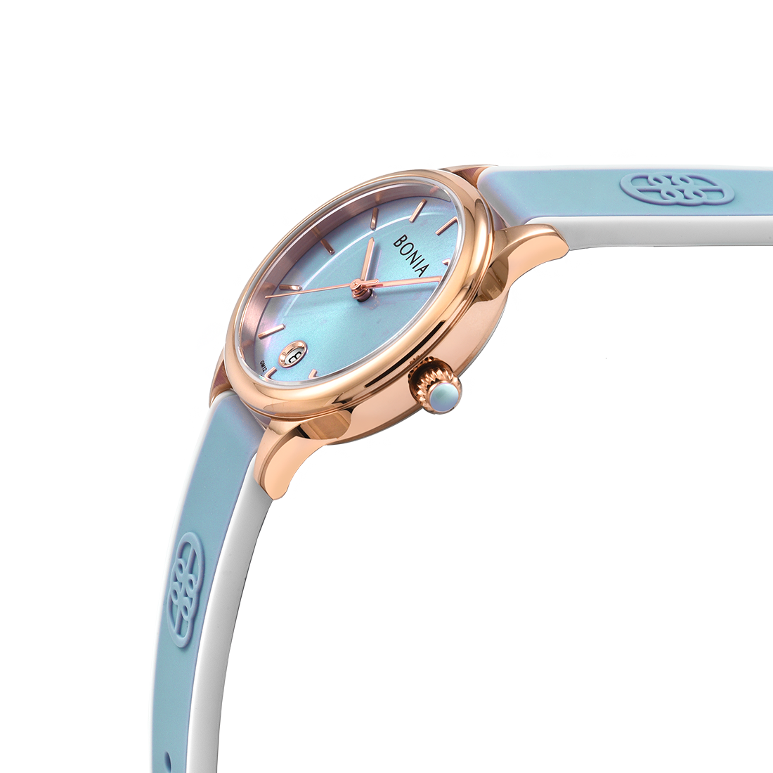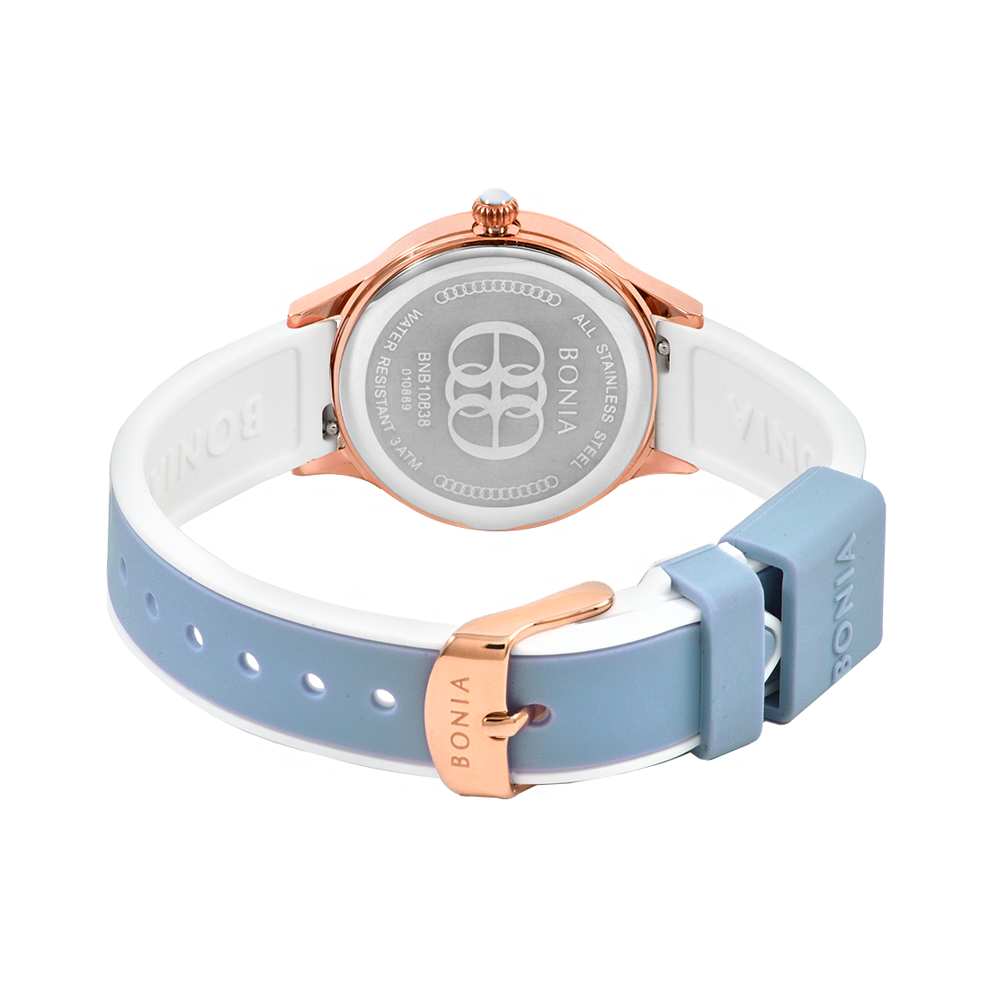 ケース:ステンレス/ローズゴールドIP バンド:シリコン/ホワイト+ライトブルー 風防:ガラス |