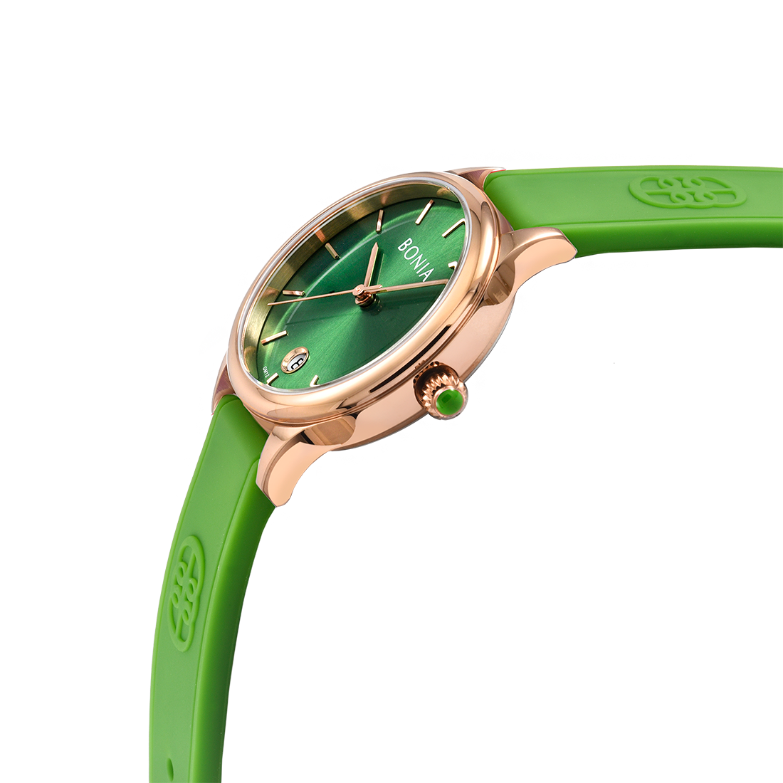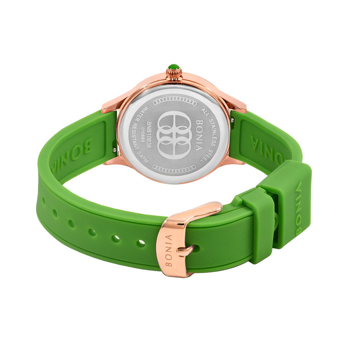 ケース:ステンレス/ローズゴールドIP バンド:シリコン/グリーン 風防:ガラス |