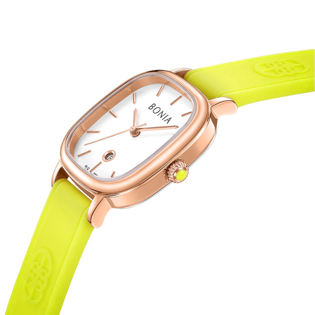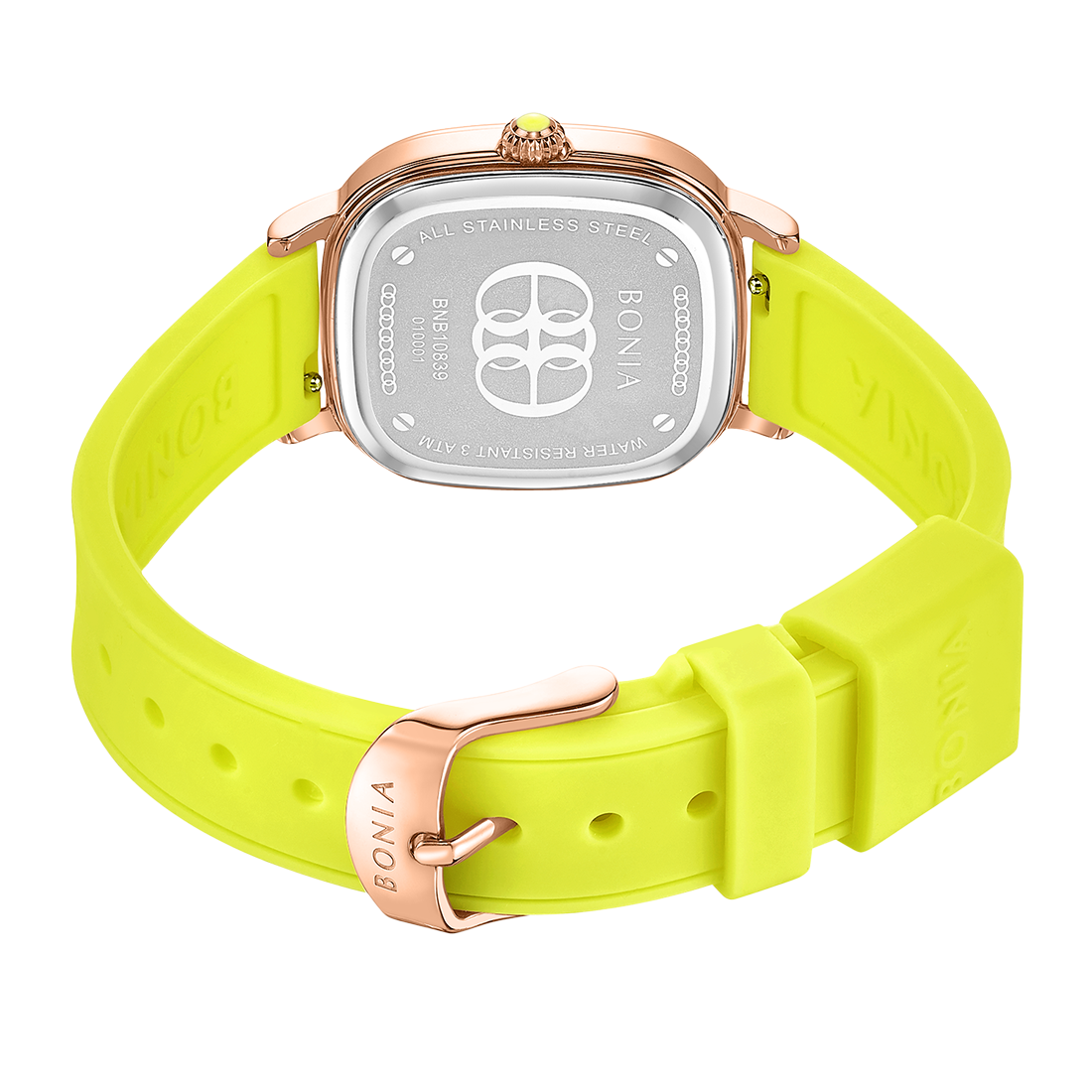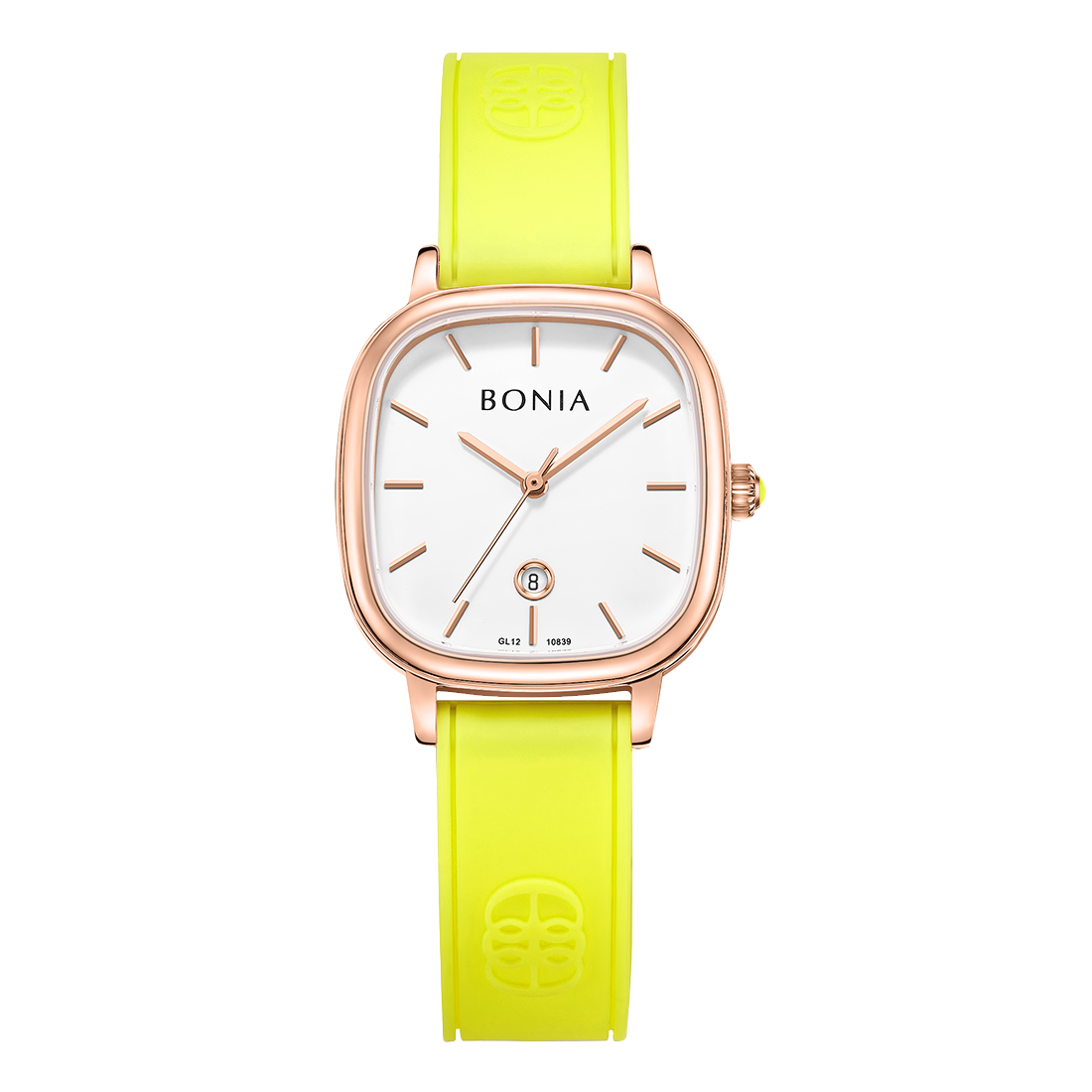 ケース:ステンレス/ローズゴールドIP バンド:シリコン/イエロー 風防:ガラス |