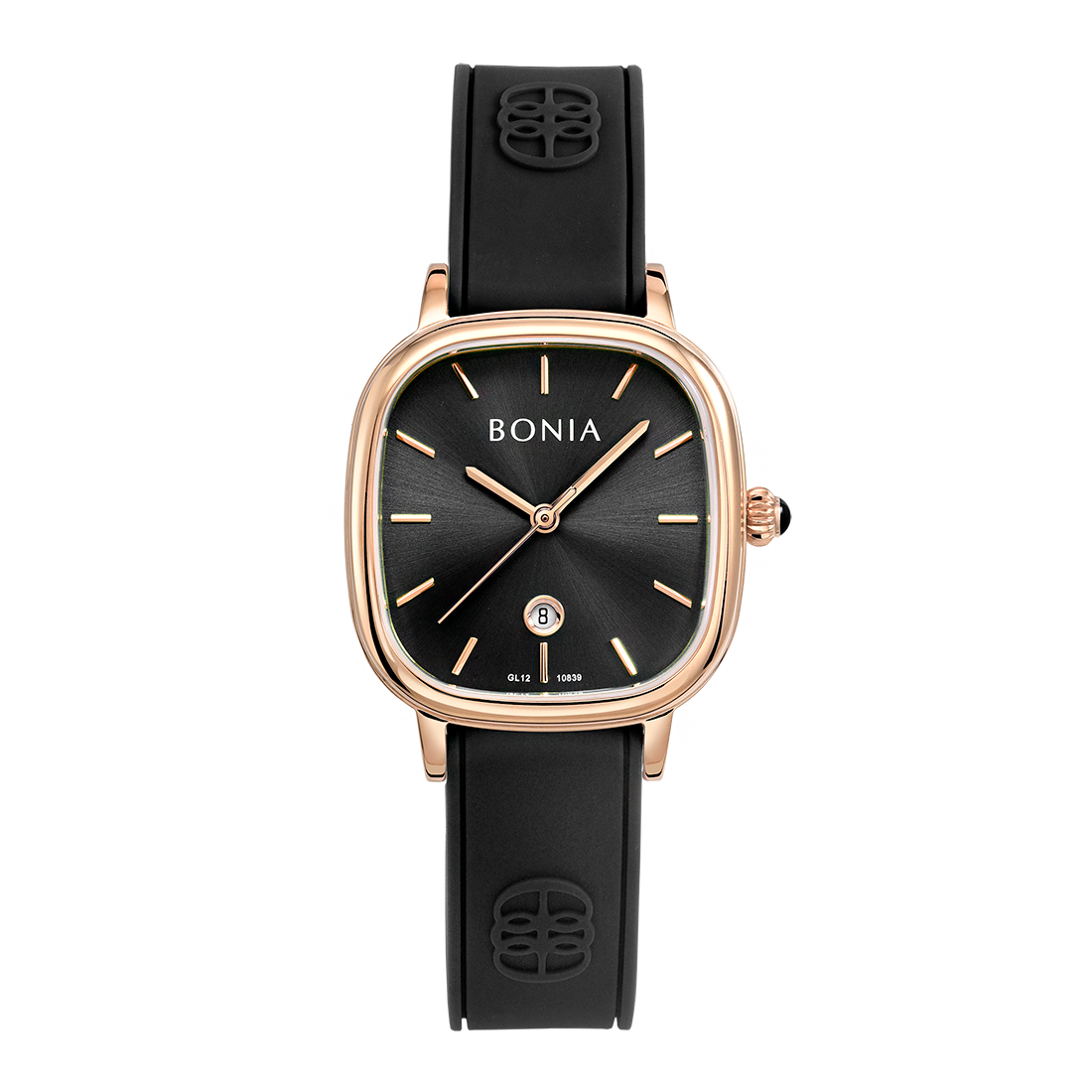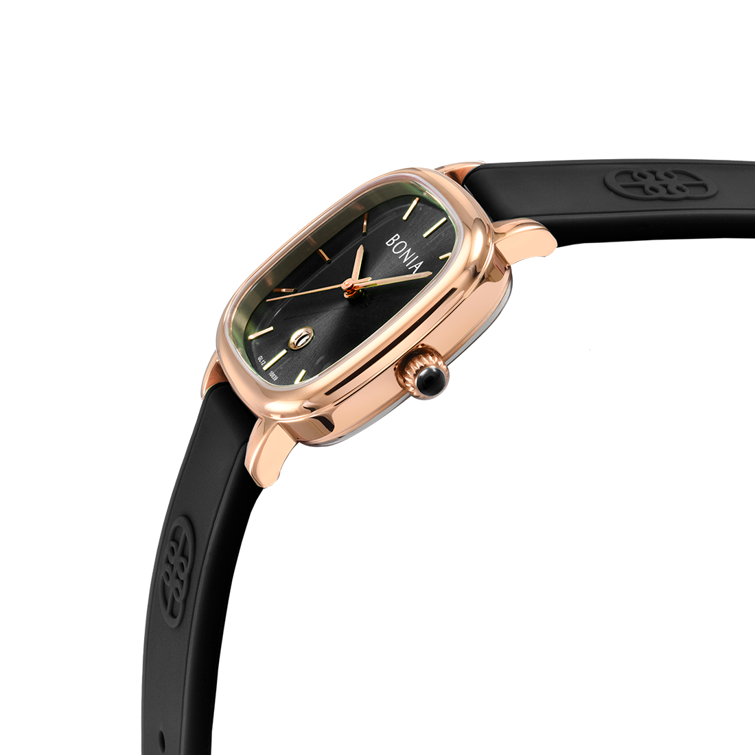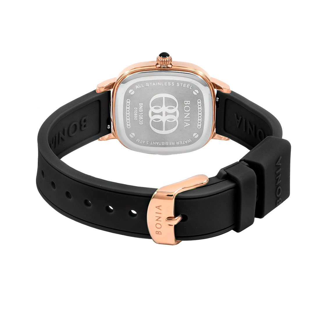 ケース:ステンレス/ローズゴールドIP バンド:シリコン/ブラック 風防:ガラス |